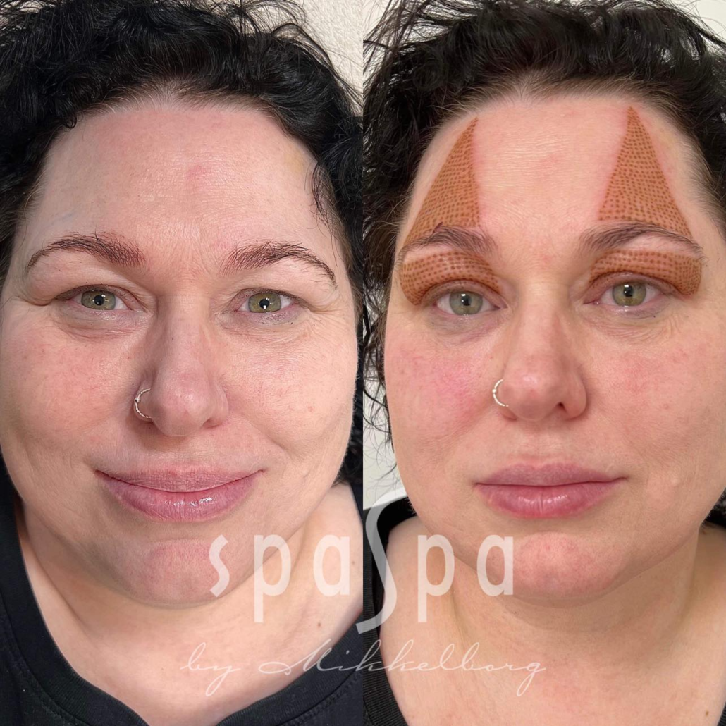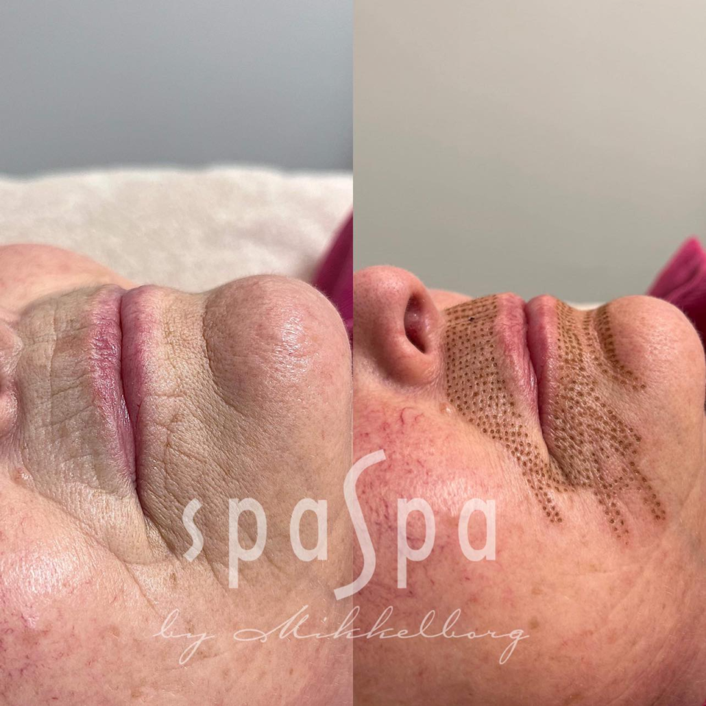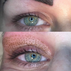 Det behandlede området vil være dekket av brune prikker. Det vil kunne ta opp til en liten uke før disse er borte, men i de fleste tilfeller 3-4 dager. Det behandlede området vil være hovent i et par dager etter behandling, dette gjelder spesielt for området rundt øyne. Denne hevelsen er en del av en såkalt fibrotisk prosess, og oppfattes som en del av behandlingen. Dette kan dekkes med mineral make up, feks jane iredale.